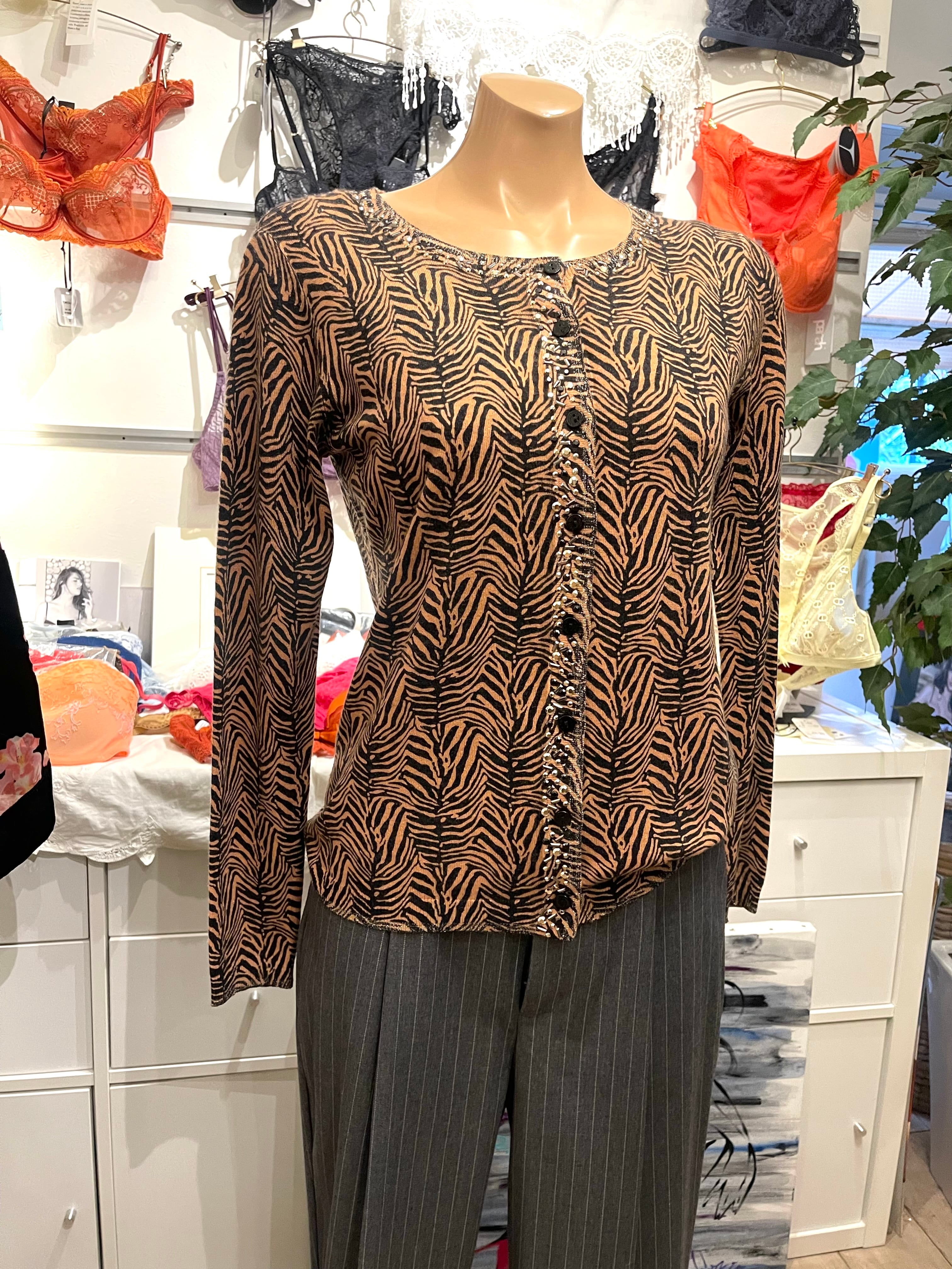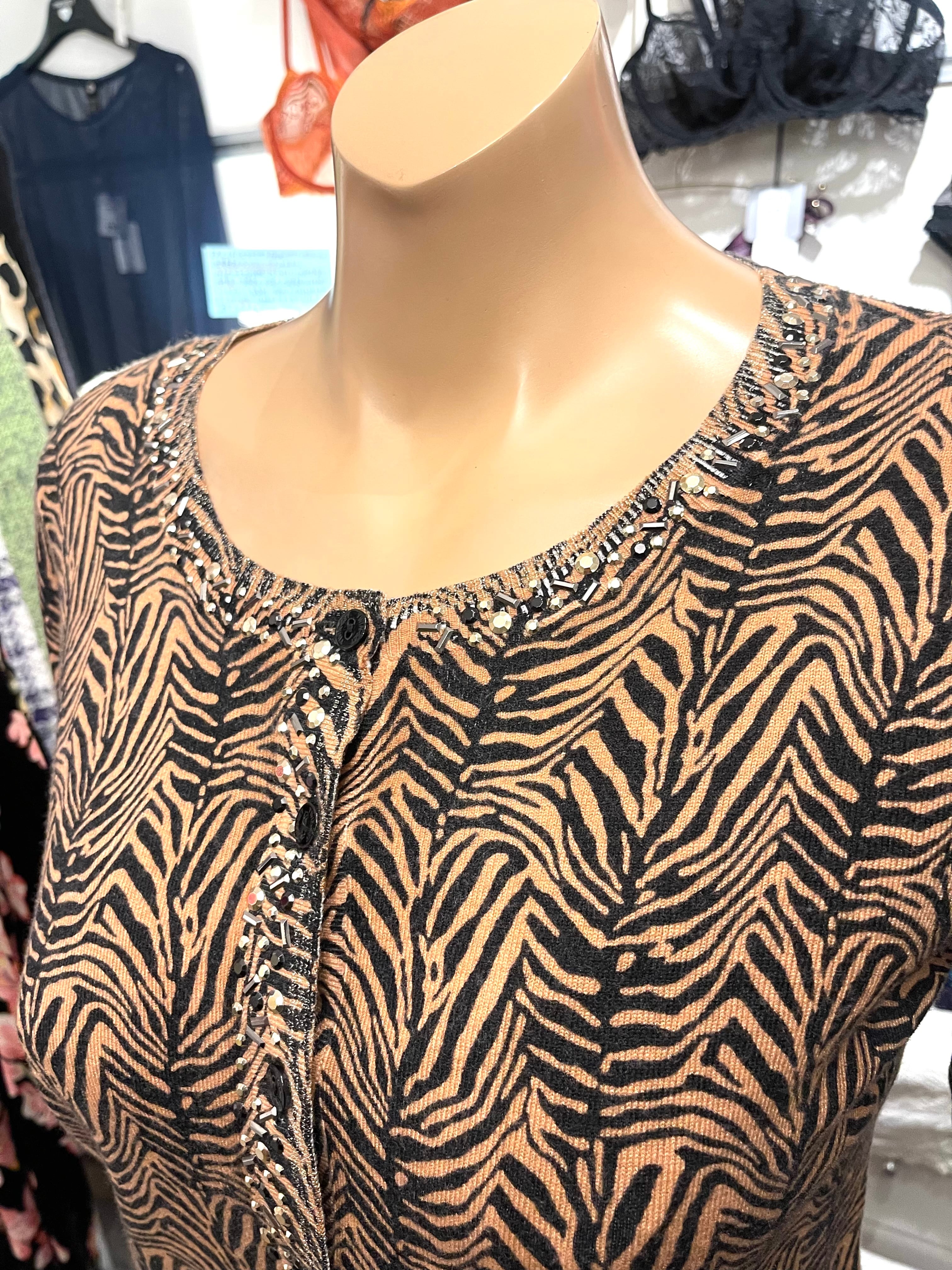 タイガー柄カーディガン、非常に華やかでブランドらしい「フェミニン×エッジ」が効いた一着です