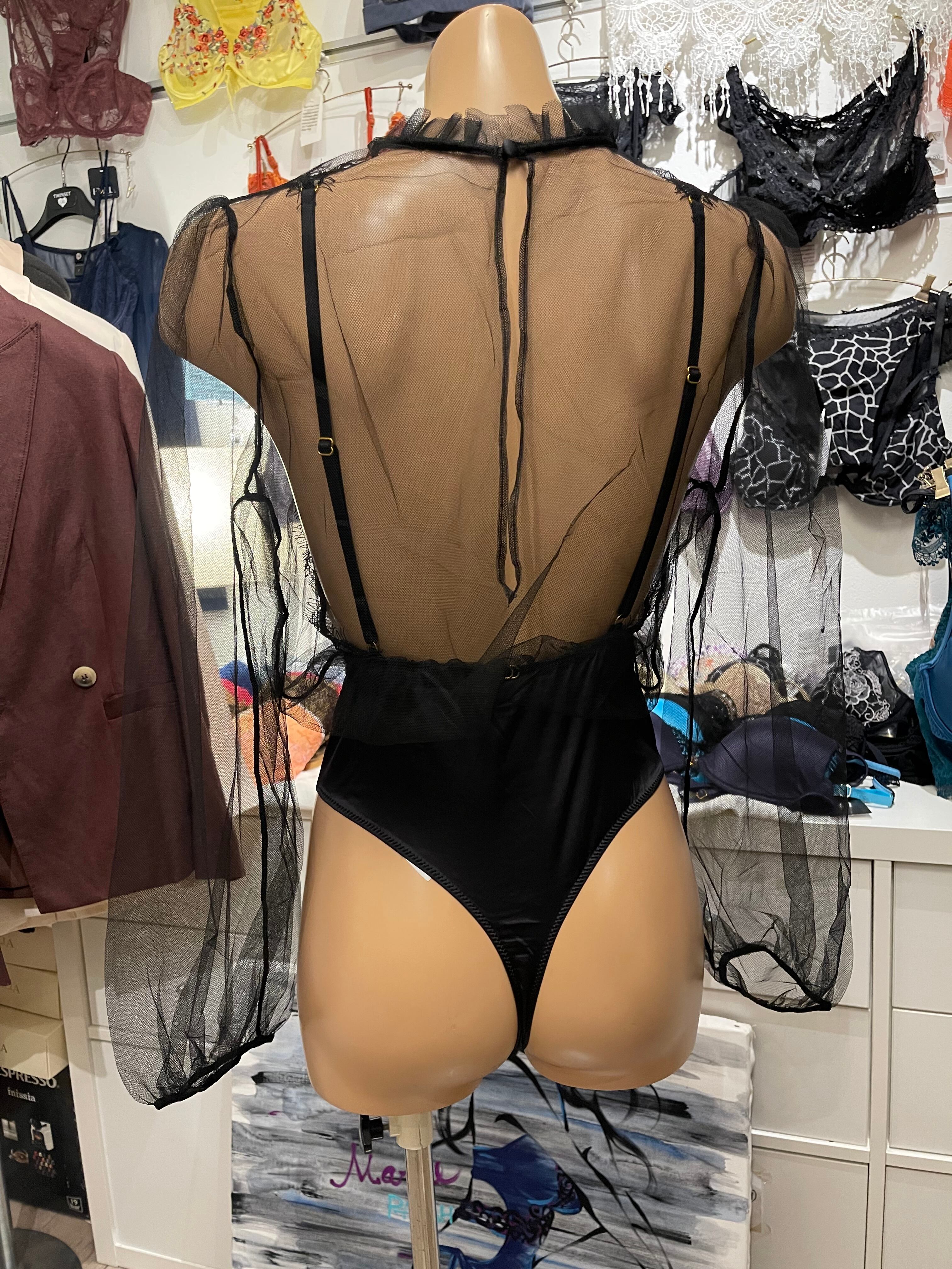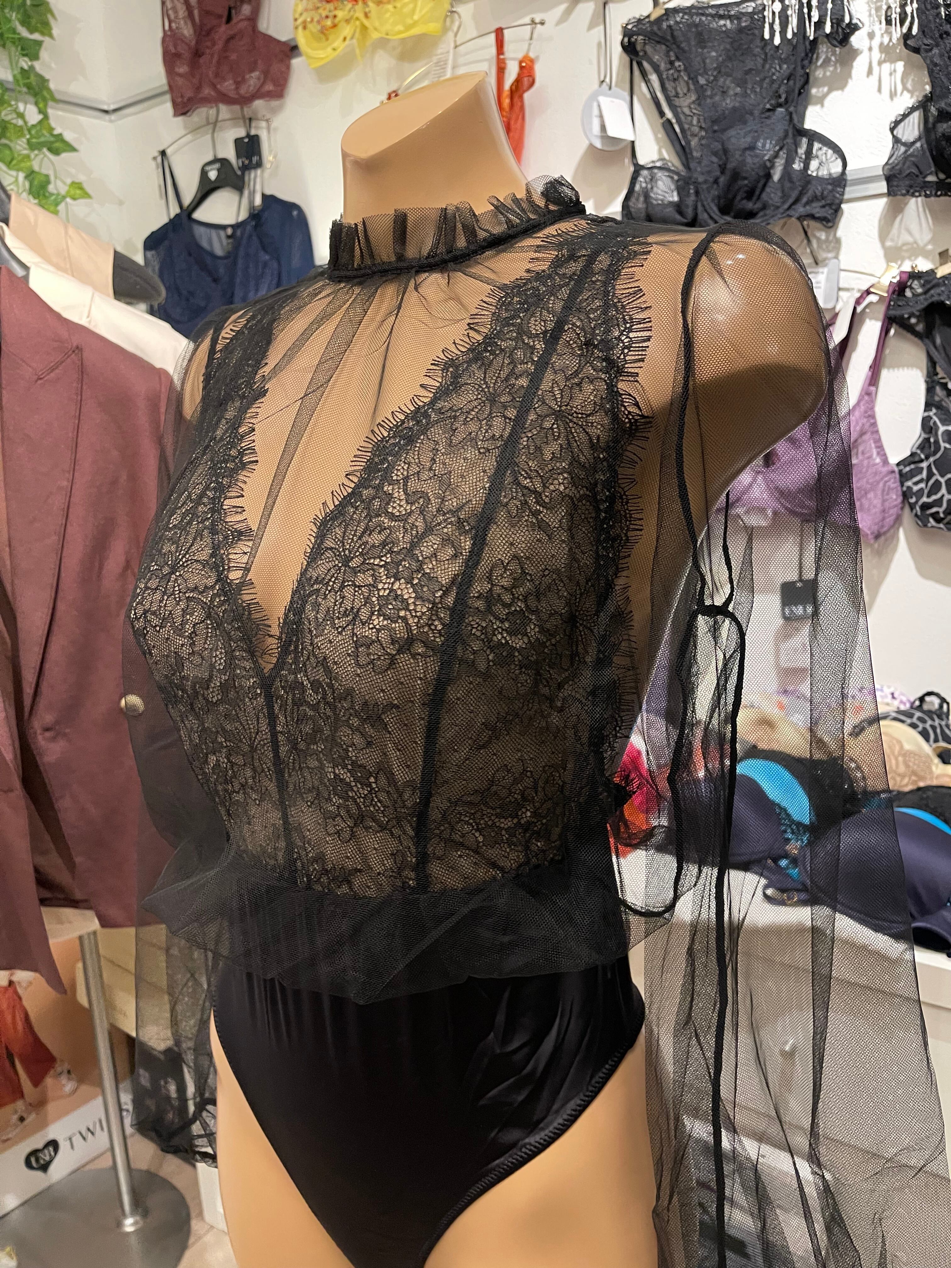 イタリアンのチュール&レースボディースーツは、ネックライン効果を備えたデザインとエレガントなスカラップレースが魅力的な特別なアイテムです。女性らしさを引き立てながら、セクシーさも感じさせるスタイルが人気です。